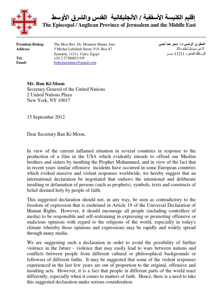 In view of the current inflamed situation in several countries in response to the production of a film in the USA which evidently intends to offend our Muslim brothers and sisters by insulting the Prophet Mohammed, and in view of the fact that in recent years similar offensive incidents have occurred in some European countries which evoked massive and violent responses worldwide, we hereby suggest that an international declaration be negotiated that outlaws the intentional and deliberate insulting or defamation of persons (such as prophets), symbols, texts and constructs of belief deemed holy by people of faith. This suggested declaration should not, in any way, be seen as contradictory to the freedom of expression that is enshrined in Article 19 of the Universal Declaration of Human Rights. However, it should encourage all people (including controllers of media) to be responsible and self-restraining in expressing or promoting offensive or malicious opinions with regard to the religions of the world, especially in today's climate whereby those opinions and expressions may be rapidly and widely spread through many media. We are suggesting such a declaration in order to avoid the possibility of further violence in the future - violence that may easily lead to wars between nations and conflicts between people from different cultural or philosophical backgrounds or followers of different faiths. It may be suggested that some of the violent responses experienced in the last few years are out of proportion to the original, offensive and insulting acts. However, it is a fact that people in different parts of the world react differently, especially when it comes to matters of faith. Hence, there is a need to take this suggested declaration under serious consideration.