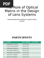 f = focal length of lens where f > 0 for convex/positive (converging) lens. Thin lens Only valid if the focal length is much greater than the thickness of the lens. n1 = refractive index outside of the lens. n2 = refractive index of the lens itself (inside the lens). R1 = Radius of curvature of First surface. R2 = Radius of curvature of Second surface. t = thickness of lens (not taking into account thickness of curved parts. If total thickness is desired, total thickness would equal t + both curved thickness parts. k = (cos /cos ) is the beam expansion factor, where is the angle of incidence, is the angle of refraction, d = prism path length, n = refractive index of the prism material. This matrix applies for orthogonal beam exit.