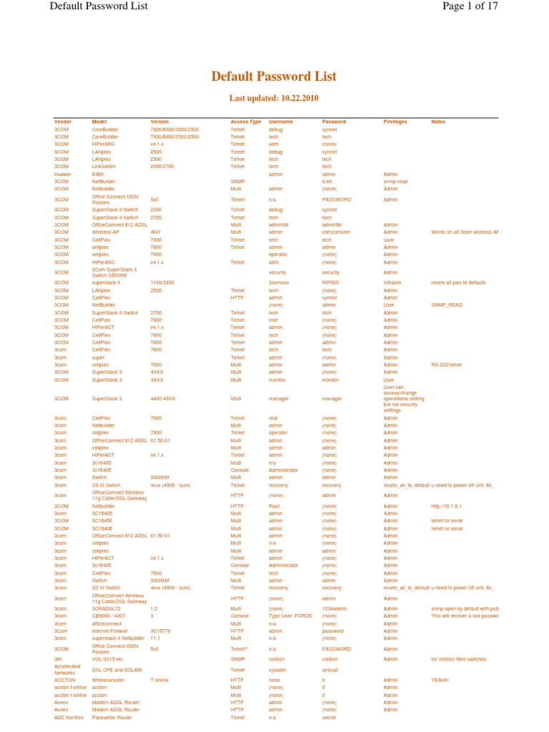 admin (none) admin admin admin (none) admin (none) (none) (none) (none) changeme(exclamation) 0 cascade cascade cascade cascade cascade cascade Ascend ascend lucenttech1 lucenttech2 UI-PSWD-01 UI-PSWD-02 (none) AitbISP4eCiG super bciimpw bcimpw bcmspw bcnaspw bluepw browsepw looker craft craftpw custpw enquirypw support indspw inads initpw locatepw maintpw rwmaint nmspw rcustpw supportpw field (none) (none) medion star RSX RSX admin admin smile default (none) root letmein (none) SYSTEM SYSTEM password (none) router motorola motorola motorola router (none) sysadm admin admin123 GlobalAdmin (none) password password 1234 1234 admin password 1234