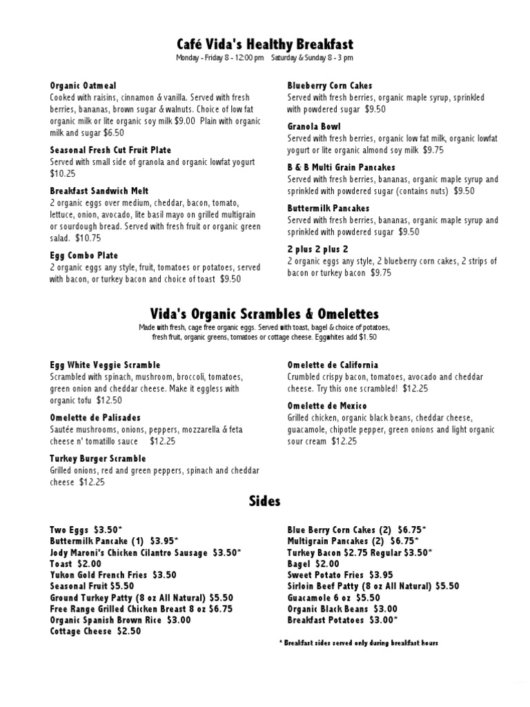 Huevos Rancheros Vida Style 2 organic over medium eggs on top of 2 corn tortillas filled with low fat mozzarella cheese, topped with homemade red and green salsas, organic black beans, organic Spanish brown rice and guacamole $11.25 Morning Wrap Spinach tortilla, low fat mozzarella, feta cheese, scrambled organic eggs, black beans, guacamole. Served with fruit or organic greens $11.00 All Day Omellete Basil, tomato, mozzarella & goat cheese $12