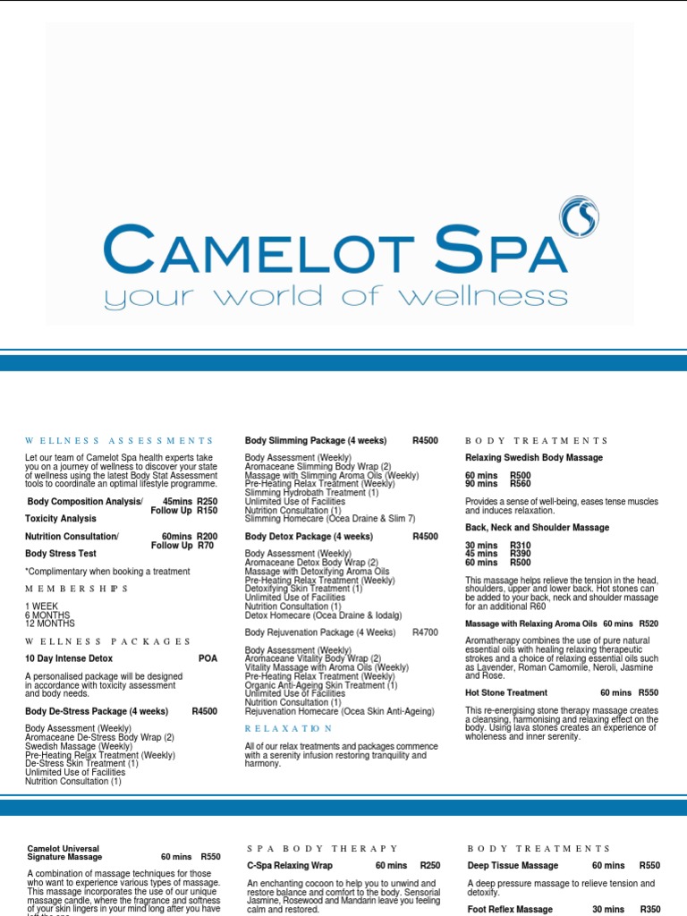 In a spirit of mutual respect we kindly request punctuality. Ensure cellular/mobile phones are switched off. Prices are subject to change without notice. Gratuities are not included in the treatment price. It is at your discretion to add a gratuity, for treatment excellence. Camelot Spa is not responsible for any theft, damage, loss or misfortune that may occur. Please note that products bought at our spas are not refundable.