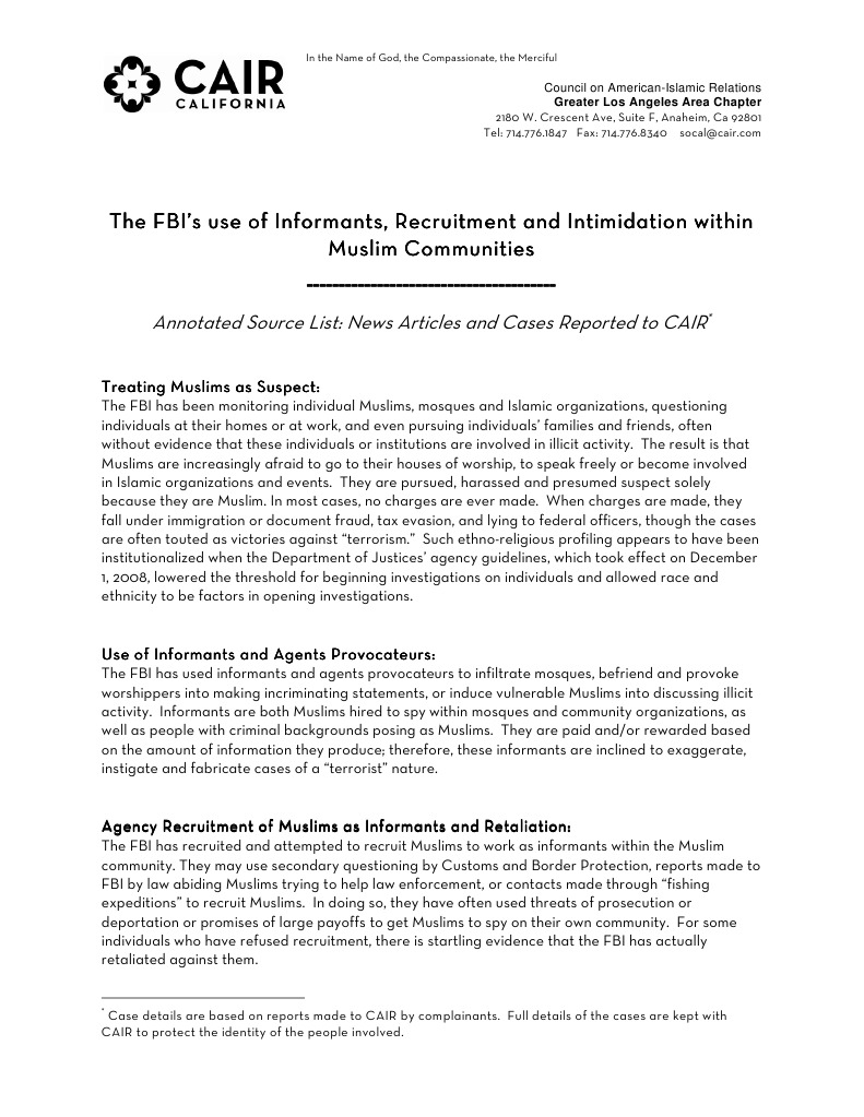 The FBI’s use of Informants, Recruitment and Intimidation withinThe FBI’s use of Informants, Recruitment and Intimidation withinThe FBI’s use of Informants, Recruitment and Intimidation withinThe FBI’s use of Informants, Recruitment and Intimidation withinMuslim CommunitiesMuslim CommunitiesMuslim CommunitiesMuslim Communities _______________________________________ _______________________________________ _______________________________________ _______________________________________