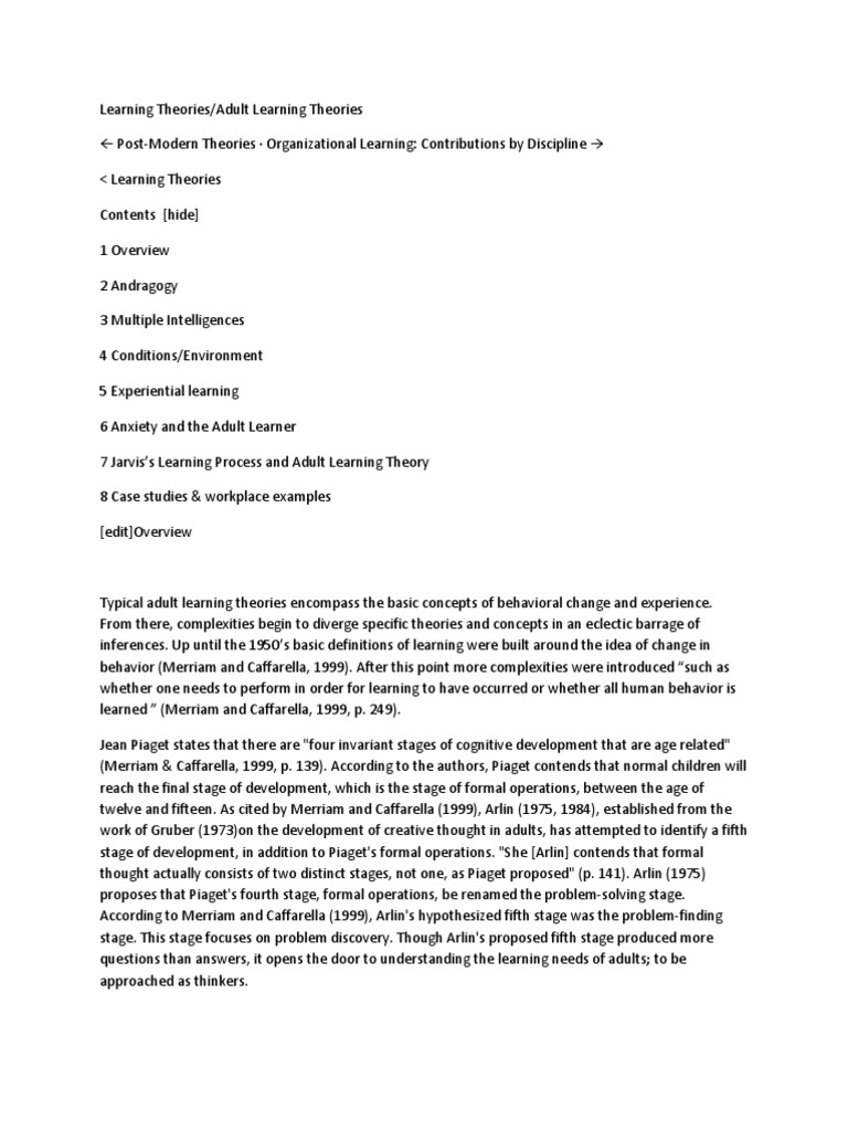 de] 1 Overview 2 Andragogy 3 Multiple Intelligences 4 Conditions/Environment 5 Experiential learning 6 Anxiety and the Adult Learner 7 Jarviss Learning Process and Adult Learning Theory 8 Case studies & workplace examples [edit]Overview
