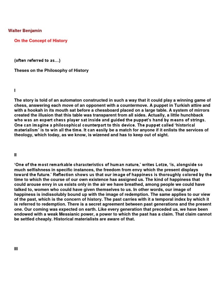 The themes which monastic discipline assigned to friars for meditation were designed to turn them away from the world and its affairs. The thoughts which we are developing here originate from similar considerations. At a moment when the politicians in whom the opponents of Fascism had placed their hopes are prostrate and confirm their defeat by betraying their own cause, these observations are intended to disintangle the political worldlings from the snares in which the traitors have entrapped them. Our consideration proceeds from the insight that the politicians stubborn faith in progress, their confidence in their mass basis, and, finally, their servile integration in an uncontrollable apparatus have been three aspects of the same thing. It seeks to convey an idea of the high price our accustomed thinking will have to pay for a conception of history that avoids any complicity with the thinking to which these politicians continue to adhere.