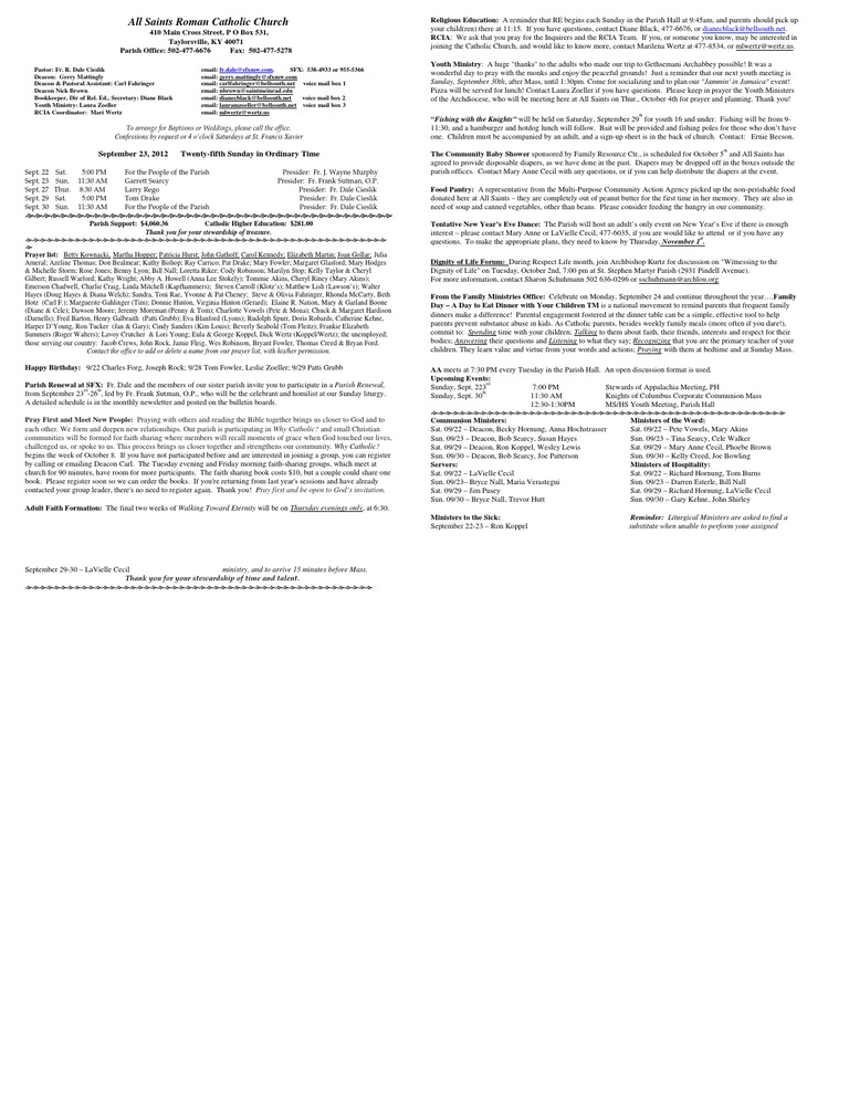 Religious Education: A reminder that RE begins each Sunday in the Parish Hall at 9:45am, and parents should pick up your child(ren) there at 11:15. If you have questions, contact Diane Black, 477-6676, or dianecblack@[Link]. RCIA: We ask that you pray for the Inquirers and the RCIA Team. If you, or someone you know, may be interested in joining the Catholic Church, and would like to know more, contact Marilena Wertz at 477-8534, or mlwertz@[Link]. Youth Ministry: A huge "thanks" to the adults who made our trip to Gethsemani Archabbey possible! It was a wonderful day to pray with the monks and enjoy the peaceful grounds! Just a reminder that our next youth meeting is Sunday, September 30th, after Mass, until 1:30pm. Come for socializing and to plan our "Jammin' in Jamaica" event! Pizza will be served for lunch! Contact Laura Zoeller if you have questions. Please keep in prayer the Youth Ministers of the Archdiocese, who will be meeting here at All Saints on Thur., October 4th for prayer and planning. Thank you! Fishing with the Knights will be held on Saturday, September 29 for youth 16 and under. Fishing will be from 911:30, and a hamburger and hotdog lunch will follow. Bait will be provided and fishing poles for those who dont have one. Children must be accompanied by an adult, and a sign-up sheet is in the back of church. Contact: Ernie Beeson. The Community Baby Shower sponsored by Family Resource Ctr., is scheduled for October 5 and All Saints has agreed to provide disposable diapers, as we have done in the past. Diapers may be dropped off in the boxes outside the parish offices. Contact Mary Anne Cecil with any questions, or if you can help distribute the diapers at the event. Food Pantry: A representative from the Multi-Purpose Community Action Agency picked up the non-perishable food donated here at All Saints they are completely out of peanut butter for the first time in her memory. They are also in need of soup and canned vegetables, other than beans. Please consider feeding the hungry in our community. Tentative New Years Eve Dance: The Parish will host an adults only event on New Years Eve if there is enough interest please contact Mary Anne or LaVielle Cecil, 477-6035, if you are would like to attend or if you have any st questions. To make the appropriate plans, they need to know by Thursday, November 1 . Dignity of Life Forum: During Respect Life month, join Archbishop Kurtz for discussion on "Witnessing to the Dignity of Life" on Tuesday, October 2nd, 7:00 pm at St. Stephen Martyr Parish (2931 Pindell Avenue). For more information, contact Sharon Schuhmann 502 636-0296 or sschuhmann@[Link] From the Family Ministries Office: Celebrate on Monday, September 24 and continue throughout the [Link] Day A Day to Eat Dinner with Your Children TM is a national movement to remind parents that frequent family dinners make a difference! Parental engagement fostered at the dinner table can be a simple, effective tool to help parents prevent substance abuse in kids. As Catholic parents, besides weekly family meals (more often if you dare!), commit to: Spending time with your children; Talking to them about faith, their friends, interests and respect for their bodies; Answering their questions and Listening to what they say; Recognizing that you are the primary teacher of your children. They learn value and virtue from your words and actions; Praying with them at bedtime and at Sunday Mass. AA meets at 7:30 PM every Tuesday in the Parish Hall. Upcoming Events: rd Sunday, Sept. 223 7:00 PM th Sunday, Sept. 30 11:30 AM 12:30-1:30PM An open discussion format is used. Stewards of Appalachia Meeting, PH Knights of Columbus Corporate Communion Mass MS/HS Youth Meeting, Parish Hall Ministers of the Word: Sat. 09/22 Pete Vowels, Mary Akins Sun. 09/23 Tina Searcy, Cele Walker Sat. 09/29 Mary Anne Cecil, Phoebe Brown Sun. 09/30 Kelly Creed, Joe Bowling Ministers of Hospitality: Sat. 09/22 Richard Hornung, Tom Burns Sun. 09/23 Darren Esterle, Bill Nall Sat. 09/29 Richard Hornung, LaVielle Cecil Sun. 09/30 Gary Kehne, John Shirley Reminder: Liturgical Ministers are asked to find a substitute when unable to perform your assigned