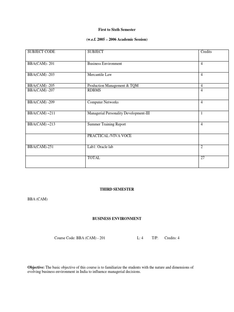 2005 2006 Academic Session) SUBJECT CODE BBA(CAM)- 201 BBA(CAM) -203 BBA(CAM) -205 BBA(CAM) -207 BBA(CAM) -209 BBA(CAM) 211 BBA(CAM) 213 SUBJECT Business Environment Mercantile Law Production Management & TQM RDBMS Computer Networks Managerial Personality Development-III Summer Training Report PRACTICAL /VIVA VOCE BBA(CAM)-251 Lab1: Oracle lab TOTAL 2 27 Credits 4 4 4 4 4 1 4