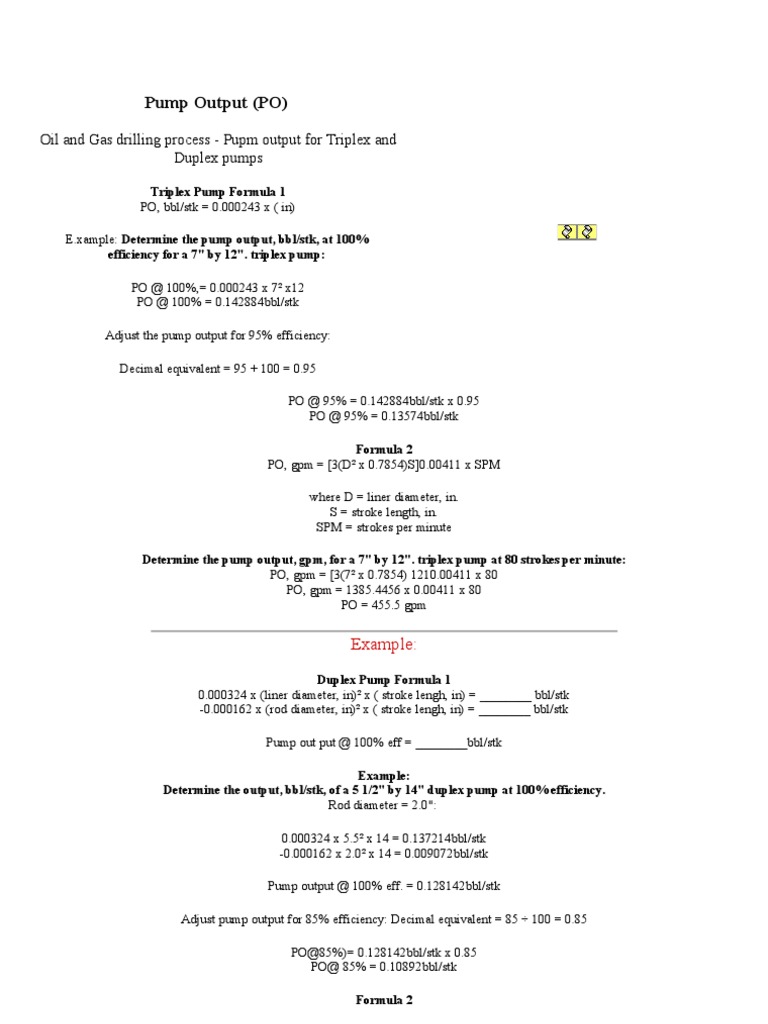 Triplex Pump Formula 1 PO, bbl/stk = 0.000243 x ( in) E.xample: Determine the pump output, bbl/stk, at 100% efficiency for a 7" by 12". triplex pump: PO @ 100%,= 0.000243 x 7 x12 PO @ 100% = 0.142884bbl/stk Adjust the pump output for 95% efficiency: Decimal equivalent = 95 + 100 = 0.95 PO @ 95% = 0.142884bbl/stk x 0.95 PO @ 95% = 0.13574bbl/stk Formula 2 PO, gpm = [3(D x 0.7854)S]0.00411 x SPM where D = liner diameter, in. S = stroke length, in. SPM = strokes per minute Determine the pump output, gpm, for a 7" by 12". triplex pump at 80 strokes per minute: PO, gpm = [3(7 x 0.7854) 1210.00411 x 80 PO, gpm = 1385.4456 x 0.00411 x 80 PO = 455.5 gpm