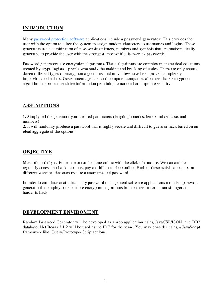 Random Password Generator will be developed as a web application using Java/JSP/JSON and DB2 database. Net Beans 7.1.2 will be used as the IDE for the same. You may consider using a JavaScript framework like jQuery/Prototype/ Scriptaculous.