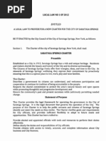 Official newspapers. The Council shall designate not more than two newspapers of general circulation in the City to be the official newspaper or newspapers. There shall be published in the official newspaper or newspapers all notices, ordinances, local laws, and other information required by law to be so published. Open meetings. Ever agency, board, commission and other entity shall conduct its business in accordance with the provisions of the Open Meetings law of the State of New York. TITLE44m Effect of Charter on Existing Laws. Repeal of 1915 Charter. The Charter of the City of Saratoga Springs, enacted in 1915 and as amended from time to time, is hereby repealed. All local laws, ordinances and resolutions of the Council and all regulations and by-laws of boards, commissions, or bodies of the City previously adopted and in effect as of the adoption of this Charter, including the City Code, shall continue in full force and effect, except to the extent that such local laws, ordinances, resolutions, regulations, and by-laws have been repealed, modified, or superseded in their applicable to the City by the adoption of this Charter. Continuation of City officers and employees. Existing terms of office shall continue uninterrupted by this Charter. All officers of the City now in office, whether elected or appointed, shall continue in office and discharge duties thereof until the end of the terms for which they are elected or appointed, and until their successors are elected or appointed and qualify as provided in this Charter. All officers and employees of the City who shall hold office or be employed under the Civil Service Law and Rules when this Charter shall take effect, shall continue in their respective positions and employment and in their respective civil service classifications and status as officers or employees of the City, insofar as such may be consistent with provisions of this Charter.