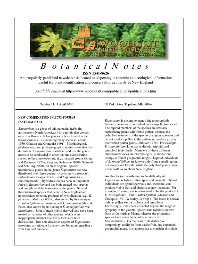 Eupatorium is a genus of tall, perennial herbs (in northeastern North America) with capitula that contain only disk flowers. It has generally been treated in the broad sense (i.e., as including many species; Fernald 1950, Gleason and Cronquist 1991). Morphological, phylogenetic, and phytogeographic studies show that this definition of Eupatorium is artificial and that the genus needs to be subdivided in order that the classification system reflects monophyletic (i.e., natural) groups (King and Robinson 1970a, King and Robinson 1970b, Schmidt and Schilling 2000). In New England, species traditionally placed in the genus Eupatorium are now distributed over three generaAgeratina (snakeroots), Eutrochium (Joe-pye weeds), and Eupatorium s.s. (thoroughworts). Hybridization has been an important force in Eupatorium and has both created new species and complicated the taxonomy of the genus. Several thoroughwort species that occur in New England are hypothesized to be the products of hybridization (e.g., E. pubescens Muhl. ex Willd., also known by its synonym E. rotundifolium var. ovatum, and E. torreyanum Short & Peter, also known by its synonym E. hyssopifolium var. laciniatum). Both of these hybrid-derived taxa have been treated as varieties of other species, which is an inappropriate manner to classify them (see later discussion). This note discusses aspects of Eupatorium taxonomy as rationale for a new combination regarding a New England endemic.