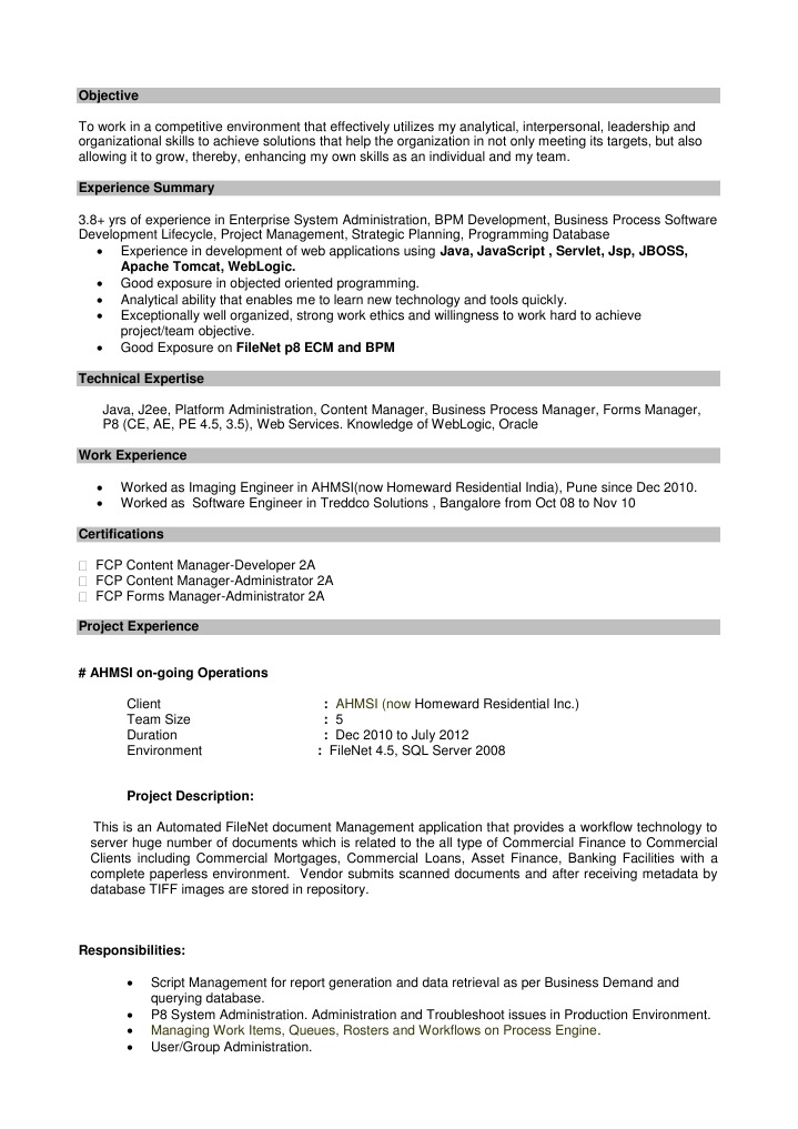 that help the organization in not only meeting its targets, but also allowing it to grow, thereby, enhancing my own skills as an individual and my team. Experience Summary 3.8+ yrs of experience in Enterprise System Administration, BPM Development, Business Process Software Development Lifecycle, Project Management, Strategic Planning, Programming Database Experience in development of web applications using Java, JavaScript , Servlet, Jsp, JBOSS, Apache Tomcat, WebLogic. Good exposure in objected oriented programming. Analytical ability that enables me to learn new technology and tools quickly. Exceptionally well organized, strong work ethics and willingness to work hard to achieve project/team objective. Good Exposure on FileNet p8 ECM and BPM Technical Expertise Java, J2ee, Platform Administration, Content Manager, Business Process Manager, Forms Manager, P8 (CE, AE, PE 4.5, 3.5), Web Services. Knowledge of WebLogic, Oracle Work Experience Worked as Imaging Engineer in AHMSI(now Homeward Residential India), Pune since Dec 2010. Worked as Software Engineer in Treddco Solutions , Bangalore from Oct 08 to Nov 10