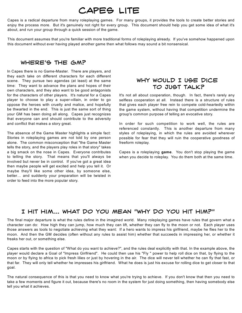 Capes is a radical departure from many roleplaying games. For many groups, it provides the tools to create better stories and enjoy the process more. But it's genuinely not right for every group. This document should help you get some idea of what it's about, and run your group through a quick session of the game. This document assumes that you're familiar with more traditional forms of roleplaying already. If you've somehow happened upon this document without ever having played another game then what follows may sound a bit nonsensical.