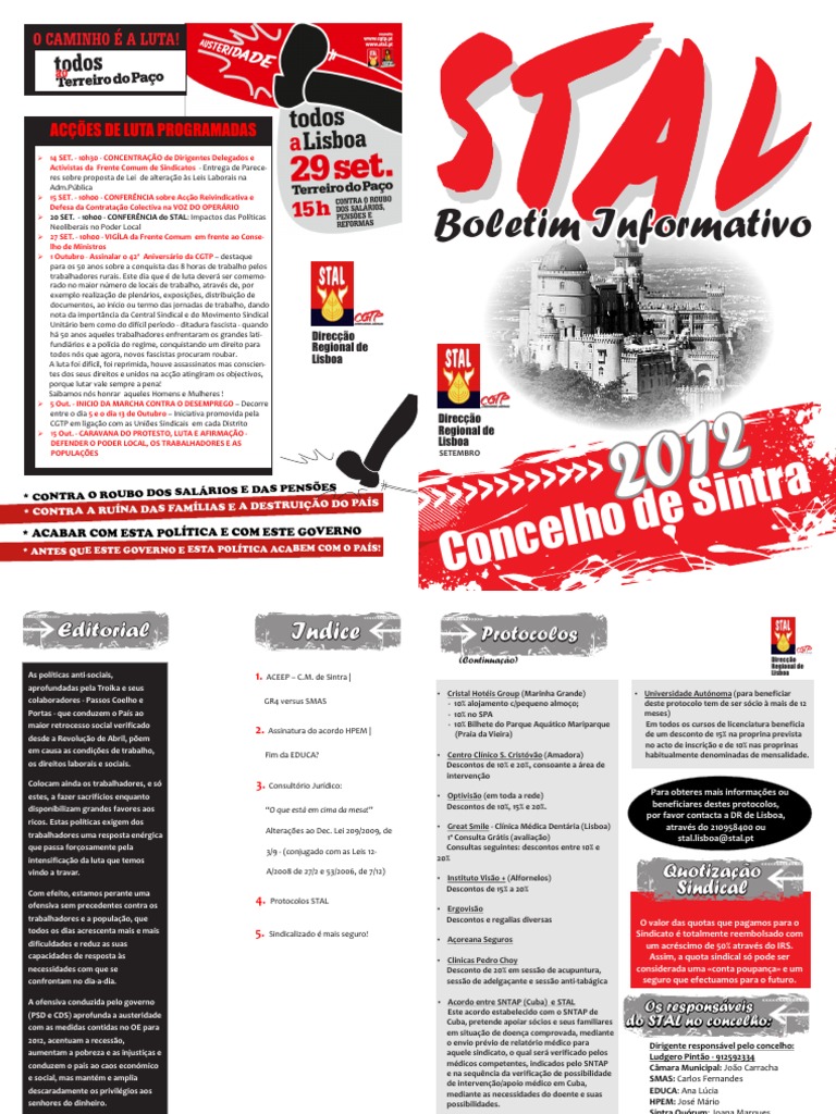 14 SET. - 10h30 - CONCENTRAO de Dirigentes Delegados e Activistas da Frente Comum de Sindicatos - Entrega de Pareceres sobre proposta de Lei de alterao s Leis Laborais na Adm.Pblica 15 SET. - 10h00 - CONFERNCIA sobre Aco Reivindicativa e Defesa da Contratao Colectiva na VOZ DO OPERRIO 20 SET. - 10h00 - CONFERNCIA do STAL: Impactos das Polticas Neoliberais no Poder Local 27 SET. - 10h00 - VIGLA da Frente Comum em frente ao Conselho de Ministros 1 Outubro - Assinalar o 42 Aniversrio da CGTP destaque para os 50 anos sobre a conquista das 8 horas de trabalho pelos trabalhadores rurais. Este dia que de luta dever ser comemorado no maior nmero de locais de trabalho, atravs de, por exemplo realizao de plenrios, exposies, distribuio de documentos, ao incio ou termo das jornadas de trabalho, dando nota da importncia da Central Sindical e do Movimento Sindical Unitrio bem como do difcil perodo - ditadura fascista - quando h 50 anos aqueles trabalhadores enfrentaram os grandes latifundirios e a polcia do regime, conquistando um direito para todos ns que agora, novos fascistas procuram roubar. A luta foi difcil, foi reprimida, houve assassinatos mas conscientes dos seus direitos e unidos na aco atingiram os objectivos, porque lutar vale sempre a pena! Saibamos ns honrar aqueles Homens e Mulheres ! 5 Out. - INICIO DA MARCHA CONTRA O DESEMPREGO Decorre entre o dia 5 e o dia 13 de Outubro Iniciativa promovida pela CGTP em ligao com as Unies Sindicais em cada Distrito 15 Out. - CARAVANA DO PROTESTO, LUTA E AFIRMAO DEFENDER O PODER LOCAL, OS TRABALHADORES E AS POPULAES