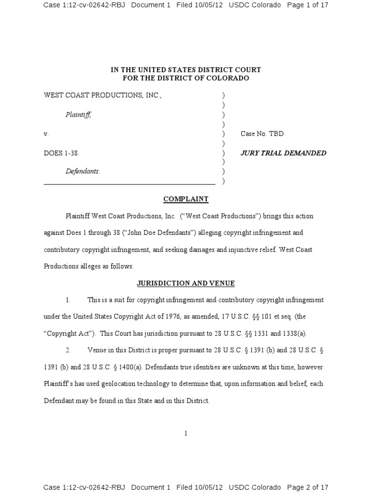 IN THE UNITED STATES DISTRICT COURT FOR THE DISTRICT OF COLORADO WEST COAST PRODUCTIONS, INC., Plaintiff, v. DOES 1-38. Defendants. _______________________________________________ COMPLAINT Plaintiff West Coast Productions, Inc. (West Coast Productions) brings this action against Does 1 through 38 (John Doe Defendants) alleging copyright infringement and contributory copyright infringement, and seeking damages and injunctive relief. West Coast Productions alleges as follows: JURISDICTION AND VENUE 1. This is a suit for copyright infringement and contributory copyright infringement ) ) ) ) ) ) ) ) ) )