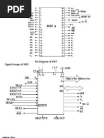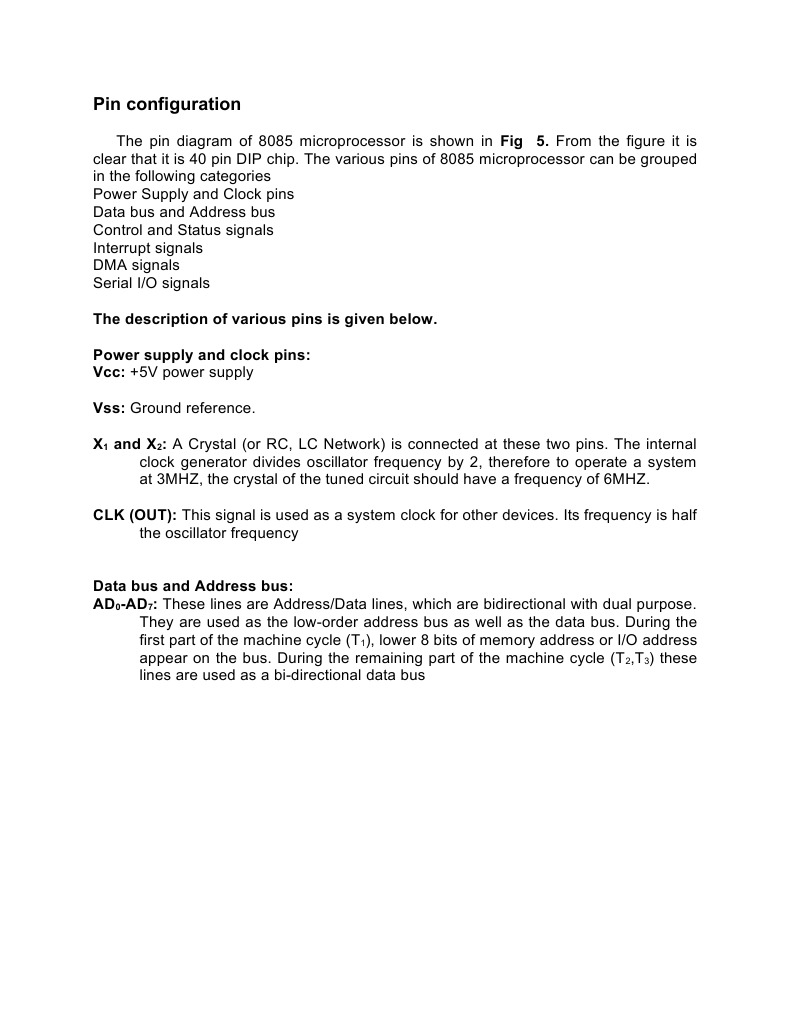 The pin diagram of 8085 microprocessor is shown in Fig 5. From the figure it is clear that it is 40 pin DIP chip. The various pins of 8085 microprocessor can be grouped in the following categories Power Supply and Clock pins Data bus and Address bus Control and Status signals Interrupt signals DMA signals Serial I/O signals The description of various pins is given below. Power supply and clock pins: Vcc: +5V power supply Vss: Ground reference. X1 and X2: A Crystal (or RC, LC Network) is connected at these two pins. The internal clock generator divides oscillator frequency by 2, therefore to operate a system at 3MHZ, the crystal of the tuned circuit should have a frequency of 6MHZ. CLK (OUT): This signal is used as a system clock for other devices. Its frequency is half the oscillator frequency Data bus and Address bus: AD0-AD7: These lines are Address/Data lines, which are bidirectional with dual purpose. They are used as the low-order address bus as well as the data bus. During the first part of the machine cycle (T1), lower 8 bits of memory address or I/O address appear on the bus. During the remaining part of the machine cycle (T 2,T3) these lines are used as a bi-directional data bus