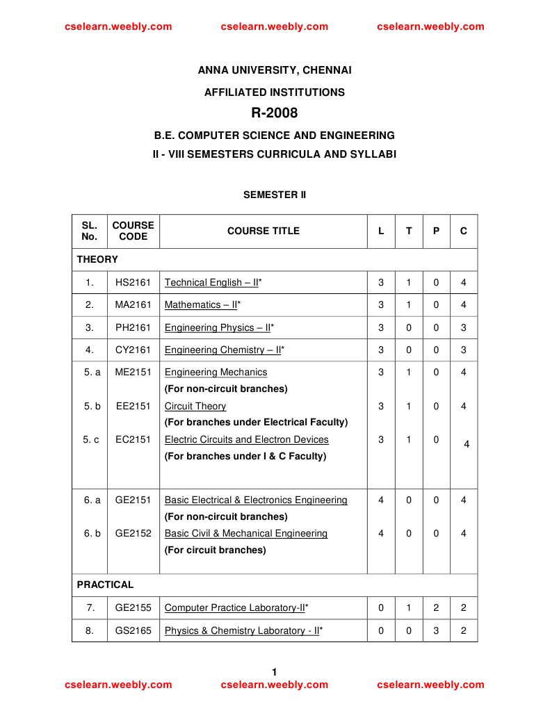 * Common to all B.E. / B.Tech. Programmes + Offering English Language Laboratory as an additional subject (with no marks) during 2 semester may be decided by the respective Colleges affiliated to Anna University Chennai. A. CIRCUIT BRANCHES I Faculty of Electrical Engineering 1. B.E. Electrical and Electronics Engineering 2. B.E. Electronics and Instrumentation Engineering 3. B.E. Instrumentation and Control Engineering II Faculty of Information and Communication Engineering 1. B.E. Computer Science and Engineering 2. B.E. Electronics and Communication Engineering 3. B.E. Bio Medical Engineering 4. B.Tech. Information Technology