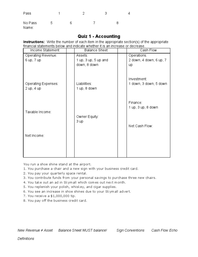 Instructions: Write the number of each item in the appropriate section(s) of the appropriate financial statements below and indicate whether it is an increase or decrease. Income Statement Balance Sheet Cash Flow Operating Revenue: Assets: Operations: 6 up, 7 up 1 up, 3 up, 5 up and 2 down, 4 down, 6 up, 7 down, 8 down up