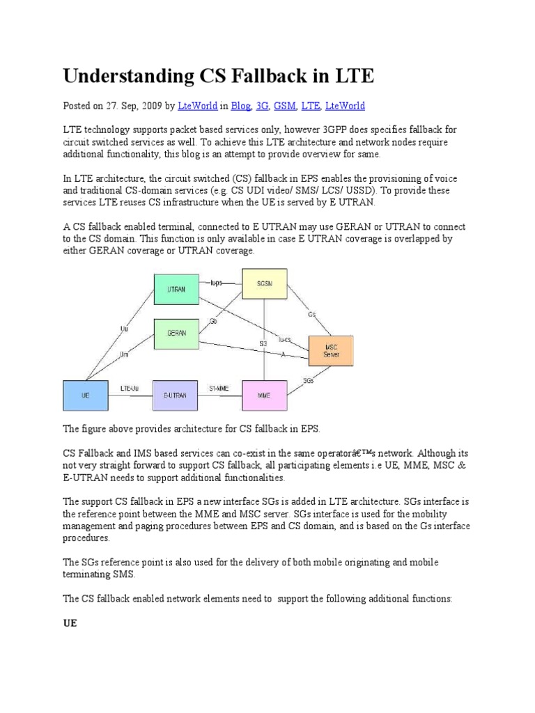 Posted on 27. Sep, 2009 by LteWorld in Blog, 3G, GSM, LTE, LteWorld LTE technology supports packet based services only, however 3GPP does specifies fallback for circuit switched services as well. To achieve this LTE architecture and network nodes require additional functionality, this blog is an attempt to provide overview for same. In LTE architecture, the circuit switched (CS) fallback in EPS enables the provisioning of voice and traditional CS-domain services (e.g. CS UDI video/ SMS/ LCS/ USSD). To provide these services LTE reuses CS infrastructure when the UE is served by E UTRAN. A CS fallback enabled terminal, connected to E UTRAN may use GERAN or UTRAN to connect to the CS domain. This function is only available in case E UTRAN coverage is overlapped by either GERAN coverage or UTRAN coverage.