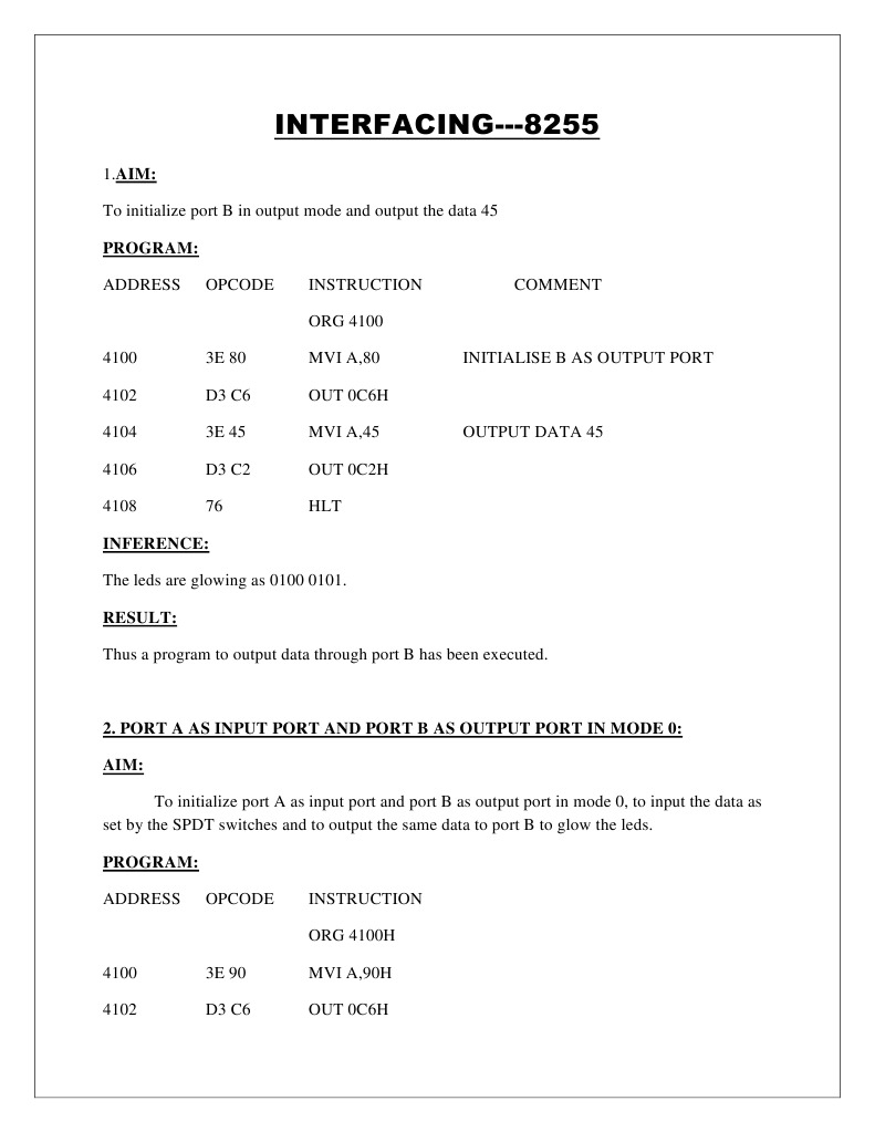 2. PORT A AS INPUT PORT AND PORT B AS OUTPUT PORT IN MODE 0: AIM: To initialize port A as input port and port B as output port in mode 0, to input the data as set by the SPDT switches and to output the same data to port B to glow the leds. PROGRAM: ADDRESS OPCODE INSTRUCTION ORG 4100H 4100 4102 3E 90 D3 C6 MVI A,90H OUT 0C6H