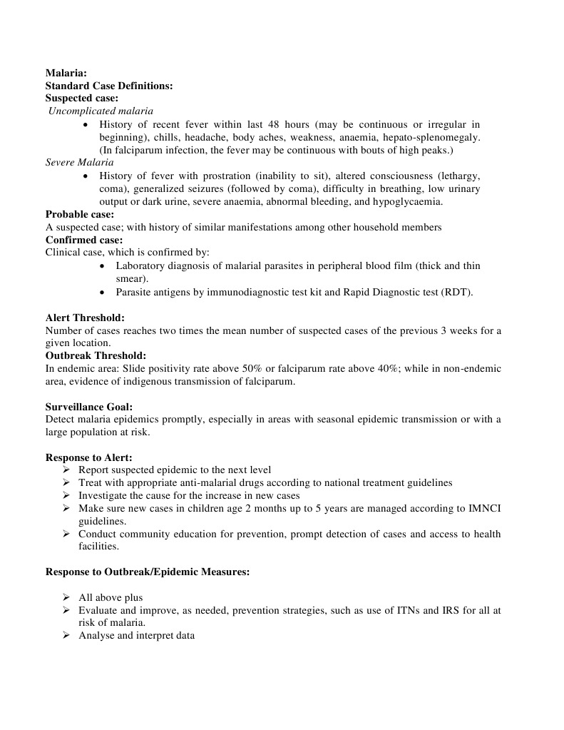y be continuous or irregular in beginning), chills, headache, body aches, weakness, anaemia, hepato-splenomegaly. (In falciparum infection, the fever may be continuous with bouts of high peaks.) Severe Malaria History of fever with prostration (inability to sit), altered consciousness (lethargy, coma), generalized seizures (followed by coma), difficulty in breathing, low urinary output or dark urine, severe anaemia, abnormal bleeding, and hypoglycaemia. Probable case: A suspected case; with history of similar manifestations among other household members Confirmed case: Clinical case, which is confirmed by: Laboratory diagnosis of malarial parasites in peripheral blood film (thick and thin smear). Parasite antigens by immunodiagnostic test kit and Rapid Diagnostic test (RDT). Alert Threshold: Number of cases reaches two times the mean number of suspected cases of the previous 3 weeks for a given location. Outbreak Threshold: In endemic area: Slide positivity rate above 50% or falciparum rate above 40%; while in non-endemic area, evidence of indigenous transmission of falciparum. Surveillance Goal: Detect malaria epidemics promptly, especially in areas with seasonal epidemic transmission or with a large population at risk. Response to Alert: Report suspected epidemic to the next level Treat with appropriate anti-malarial drugs according to national treatment guidelines Investigate the cause for the increase in new cases Make sure new cases in children age 2 months up to 5 years are managed according to IMNCI guidelines. Conduct community education for prevention, prompt detection of cases and access to health facilities. Response to Outbreak/Epidemic Measures: All above plus Evaluate and improve, as needed, prevention strategies, such as use of ITNs and IRS for all at risk of malaria. Analyse and interpret data