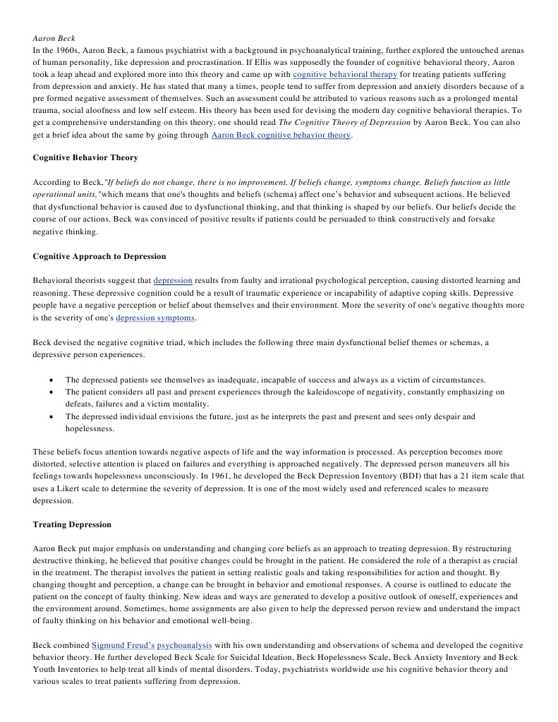 untouched arenas of human personality, like depression and procrastination. If Ellis was supposedly the founder of cognitive behavioral theory, Aaron took a leap ahead and explored more into this theory and came up with cognitive behavioral therapy for treating patients suffering from depression and anxiety. He has stated that many a times, people tend to suffer from depression and anxiety disorders because of a pre formed negative assessment of themselves. Such an assessment could be attributed to various reasons such as a prolonged mental trauma, social aloofness and low self esteem. His theory has been used for devising the modern day cognitive behavioral therapies. To get a comprehensive understanding on this theory, one should read The Cognitive Theory of Depression by Aaron Beck. You can also get a brief idea about the same by going through Aaron Beck cognitive behavior theory. Cognitive Behavior Theory According to Beck,"If beliefs do not change, there is no improvement. If beliefs change, symptoms change. Beliefs function as little operational units,"which means that one's thoughts and beliefs (schema) affect ones behavior and subsequent actions. He believed that dysfunctional behavior is caused due to dysfunctional thinking, and that thinking is shaped by our beliefs. Our beliefs decide the course of our actions. Beck was convinced of positive results if patients could be persuaded to think constructively and forsake negative thinking. Cognitive Approach to Depression Behavioral theorists suggest that depression results from faulty and irrational psychological perception, causing distorted learning and reasoning. These depressive cognition could be a result of traumatic experience or incapability of adaptive coping skills. Depressive people have a negative perception or belief about themselves and their environment. More the severity of one's negative thoughts more is the severity of one's depression symptoms. Beck devised the negative cognitive triad, which includes the following three main dysfunctional belief themes or schemas, a depressive person experiences. The depressed patients see themselves as inadequate, incapable of success and always as a victim of circumstances. The patient considers all past and present experiences through the kaleidoscope of negativity, constantly emphasizing on defeats, failures and a victim mentality. The depressed individual envisions the future, just as he interprets the past and present and sees only despair and hopelessness.