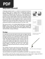 A bayonet mount (mainly as a method of mechanical attachment, as for fitting a lens to a camera) or bayonet connector (for electrical use) is a fastening mechanism consisting of a cylindrical male side with one or more radial pins, and a female receptor with matching L -shaped slot(s) and with spring(s) to keep the two parts locked together. The slots are shaped like a capital letter L with serif (a short upward segment at the end of the horizontal arm); the pin slides into the vertical arm of the L , rotates across the horizontal arm, then is pushed slightly upwards into the short vertical "serif" by the spring; the connector is no longer free to rotate unless pushed down against the spring until the pin is out of the "serif". To couple the two parts, the pin(s) on the male are aligned with the slot(s) on the female and the two pushed together. Once the pins reach the bottom of the slot, one or both parts are rotated so that the pin slides along the horizontal arm of the L until it reaches the "serif". The spring then pushes the male connector up into the "serif" to keep the pin locked into place. A practised user can connect them quickly and, unlike screw connectors, they are not subject to cross-threading. To disconnect, the two parts are pushed together to move the pin out of the "serif" while twisting in the opposite direction than for connecting, and then pulling apart. The strength of the joint comes from the strength of the pins and the L slots, and the spring. To disengage unintentionally, the pins must break, the sleeve into which the connector slides must be distorted or torn enough to free the pins, or the spring must fail and allow the connector to be pushed down and rotate due to, say, vibration. It is often possible to push down the connector and rotate it, but not far enough to engage and lock; it will stay in place temporarily, but accidental disconnection is very likely.