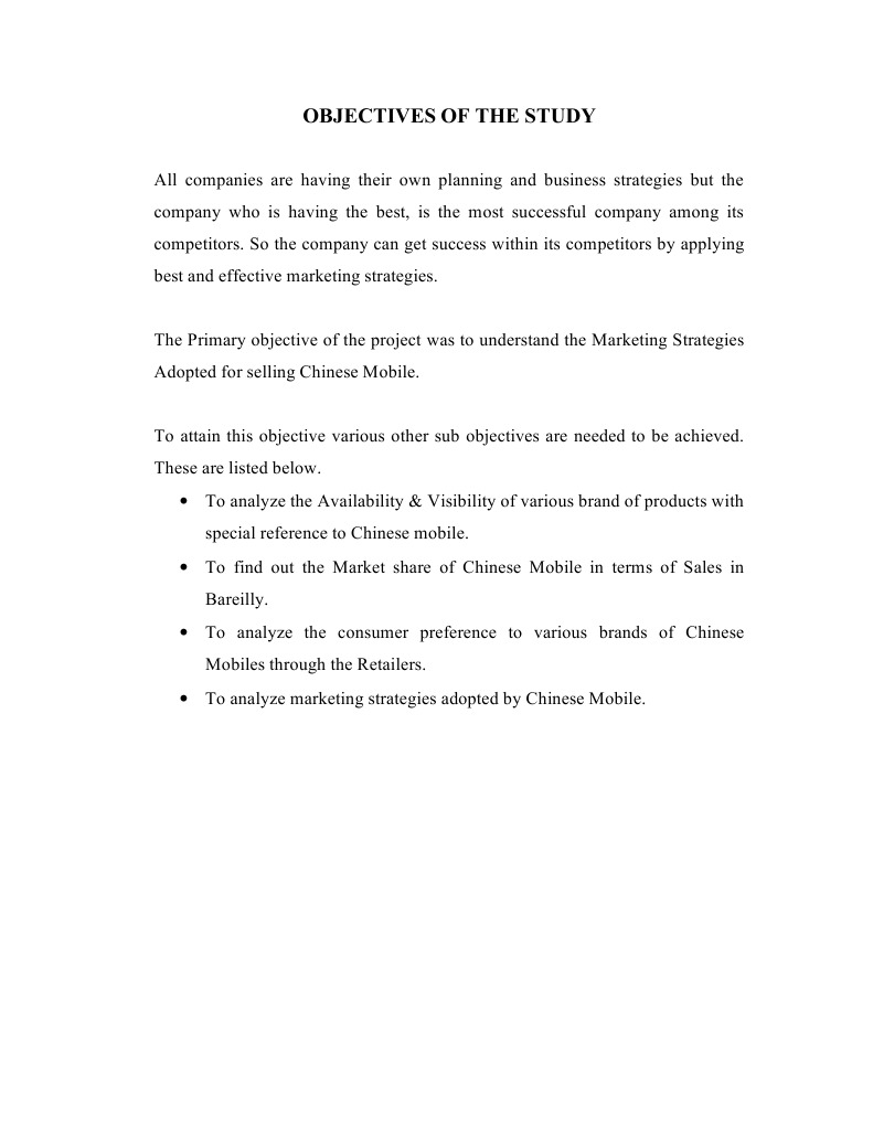 All companies are having their own planning and business strategies but the company who is having the best, is the most successful company among its competitors. So the company can get success within its competitors by applying best and effective marketing strategies. The Primary objective of the project was to understand the Marketing Strategies Adopted for selling Chinese Mobile. To attain this objective various other sub objectives are needed to be achieved. These are listed below. To analyze the Availability & Visibility of various brand of products with special reference to Chinese mobile. To find out the Market share of Chinese Mobile in terms of Sales in Bareilly. To analyze the consumer preference to various brands of Chinese Mobiles through the Retailers. To analyze marketing strategies adopted by Chinese Mobile.