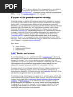 Marketing strategy is a process that can allow an organization to concentrate its limited resources on the greatest opportunities to increase sales and achieve a sustainable competitive advantage. Developing a marketing strategy Marketing strategies serve as the fundamental underpinning of marketing plans designed to fill market needs and reach marketing objectives. Plans and objectives are generally tested for measurable results. Commonly, marketing strategies are developed as multi-year plans, with a tactical plan detailing specific actions to be accomplished in the current year. Time horizons covered by the marketing plan vary by company, by industry, and by nation, however, time horizons are becoming shorter as the speed of change in the environment increases. Marketing strategies are dynamic and interactive. They are partially planned and partially unplanned. See strategy dynamics. Marketing strategy involves careful scanning of the internal and external environments. Internal environmental factors include the marketing mix, plus performance analysis and strategic constraints. External environmental factors include customer analysis, competitor analysis, target market analysis, as well as evaluation of any elements of the technological, economic, cultural or political/legal environment likely to impact success. A key component of marketing strategy is often to keep marketing in line with a company's overarching mission statement. Once a thorough environmental scan is complete, a strategic plan can be constructed to identify business alternatives, establish challenging goals, determine the optimal marketing mix to attain these goals, and detail implementation. A final step in developing a marketing strategy is to create a plan to monitor progress and a set of contingencies if problems arise in the implementation of the plan.