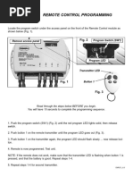 1. Push the program switch (SW1) (Fig. 2) until the red program LED lights solid, then release switch. 2. Push button 1 on the remote transmitter until the program LED goes out (Fig. 3). 3. Push button 1 on the transmitter again, the program LED should flash slowly ... now release button. 4. Remote is now programmed. Test unit. NOTE: If the remote does not work, make sure that the transmitter LED is flashing when button 1 is pressed, and that the battery is good. Repeat steps 1-4. 5. Repeat steps 1-4 for second transmitter.