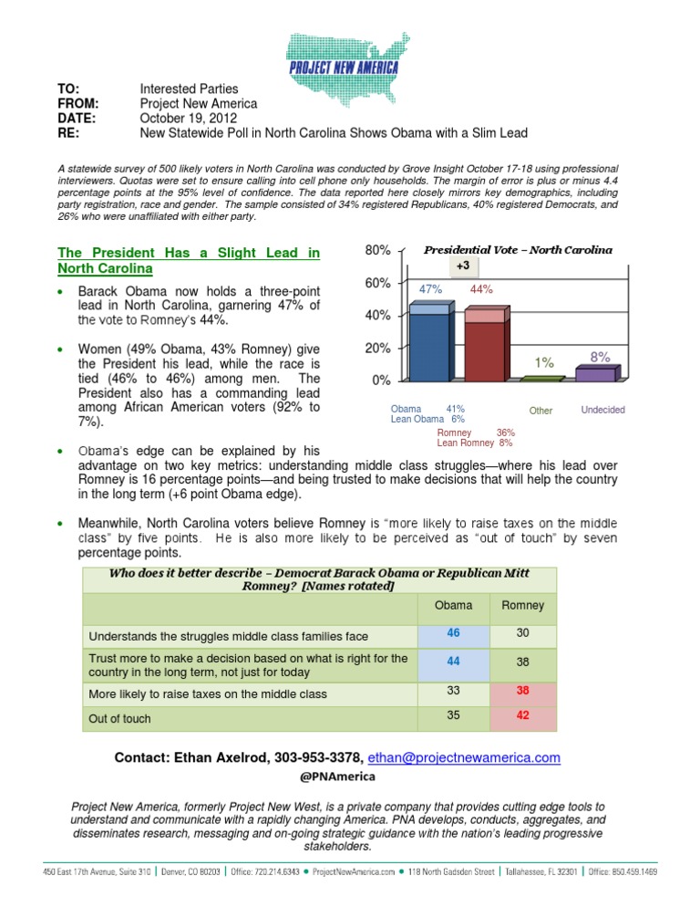 Interested Parties Project New America October 19, 2012 New Statewide Poll in North Carolina Shows Obama with a Slim Lead