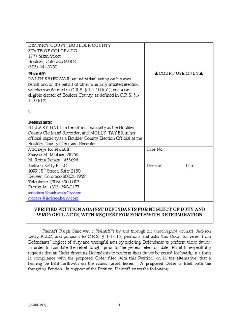 Election watcher files lawsuit against Boulder County Clerk and Recorder for denying access to witness the conduct of an election.
