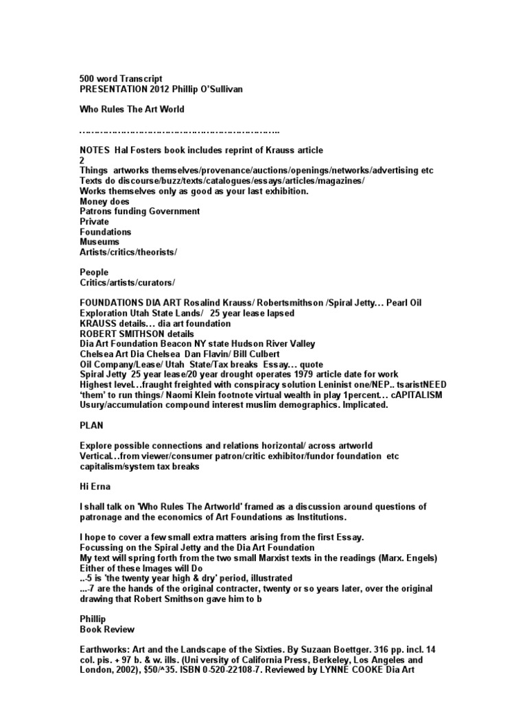 NOTES Hal Fosters book includes reprint of Krauss article 2 Things artworks themselves/provenance/auctions/openings/networks/advertising etc Texts do discourse/buzz/texts/catalogues/essays/articles/magazines/ Works themselves only as good as your last exhibition. Money does Patrons funding Government Private Foundations Museums Artists/critics/theorists/ People Critics/artists/curators/ FOUNDATIONS DIA ART Rosalind Krauss/ Robertsmithson /Spiral Jetty Pearl Oil Exploration Utah State Lands/ 25 year lease lapsed KRAUSS details dia art foundation ROBERT SMITHSON details Dia Art Foundation Beacon NY state Hudson River Valley Chelsea Art Dia Chelsea Dan Flavin/ Bill Culbert Oil Company/Lease/ Utah State/Tax breaks Essay quote Spiral Jetty 25 year lease/20 year drought operates 1979 article date for work Highest levelfraught freighted with conspiracy solution Leninist one/NEP.. tsaristNEED them to run things/ Naomi Klein footnote virtual wealth in play 1percent cAPITALISM Usury/accumulation compound interest muslim demographics. Implicated. PLAN Explore possible connections and relations horizontal/ across artworld Verticalfrom viewer/consumer patron/critic exhibitor/fundor foundation etc capitalism/system tax breaks Hi Erna I shall talk on 'Who Rules The Artworld' framed as a discussion around questions of patronage and the economics of Art Foundations as Institutions. I hope to cover a few small extra matters arising from the first Essay. Focussing on the Spiral Jetty and the Dia Art Foundation My text will spring forth from the two small Marxist texts in the readings (Marx. Engels) Either of these Images will Do ..-5 is 'the twenty year high & dry' period, illustrated ...-7 are the hands of the original contracter, twenty or so years later, over the original drawing that Robert Smithson gave him to b Phillip Book Review Earthworks: Art and the Landscape of the Sixties. By Suzaan Boettger. 316 pp. incl. 14 col. pis. + 97 b. & w. ills. (Uni versity of California Press, Berkeley, Los Angeles and London, 2002), $50/^35. ISBN 0-520-22108-7. Reviewed by LYNNE COOKE Dia Art