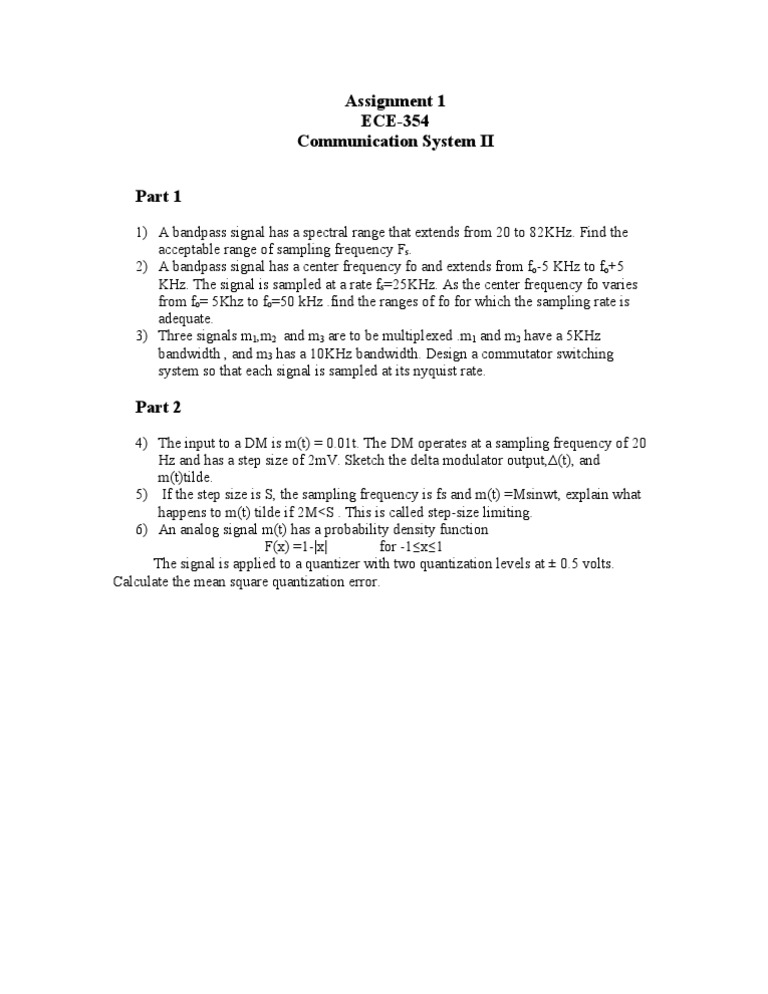 1) A bandpass signal has a spectral range that extends from 20 to 82KHz. Find the acceptable range of sampling frequency Fs. 2) A bandpass signal has a center frequency fo and extends from fo-5 KHz to fo+5 KHz. The signal is sampled at a rate fs=25KHz. As the center frequency fo varies from fo= 5Khz to fo=50 kHz .find the ranges of fo for which the sampling rate is adequate. 3) Three signals m1,m2 and m3 are to be multiplexed .m1 and m2 have a 5KHz bandwidth , and m3 has a 10KHz bandwidth. Design a commutator switching system so that each signal is sampled at its nyquist rate.