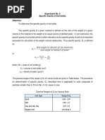 Observation Number Evaporating Dish Number Weight of flask + Water filled to mark, W1 (g) Weight of flask + Water filled to mark + soil, W2 (g) Weight of dry soil Ws (g) Water of equal volume of water as the soil solids, Ww (g) = (W1 + Ws) W2) Gs (T1C) = Ws / Ww Gs (20C) = Gs (T1C) A Average Specific Gravity (Gs) at 20C 1 15-4 677.60 739.90 99.90 37.60 2.657 2.656 ----2 MD 677.30 739.30 99.74 37.74 2.643 2.642 ----3 ME 677.30 739.70 100.23 37.83 2.649 2.648 2.649