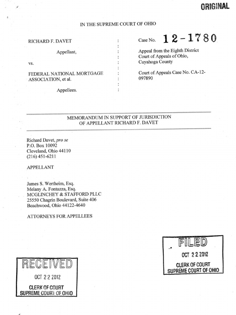 Richard Davet, pro se P.O. Box 10092 Cleveland, Ohio 44110 (216) 451-6211 CERTIFICATE OF SERVICE This is to certify that a true and accurate copy of the foregoing jurisdictional memorandum of the Appellant was sent by regular U.S. Mail on October 19, 2012, to counsel for Appellees, James S. Wertheim, Esq. and i^eiany A. Fontazza, Esq., MCCI,IT1CUEi' c^ STAFFORD PLLC, 25550 Chagrin Boulevard, Suite 406, Beachwood, Ohio 44122-4640.