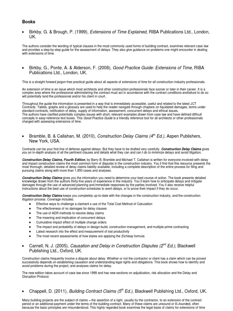 Davison, R. & Mullen, J. (2009), Evaluating Contracts Claims (2nd Ed.), Blackwell Publishing Ltd., Oxford, UK. Eggleston, B. (2009), Liquidated Damages and Extensions of Time: In Construction Contracts (3rd Ed.), Blackwell Publishing Ltd., Oxford, UK.