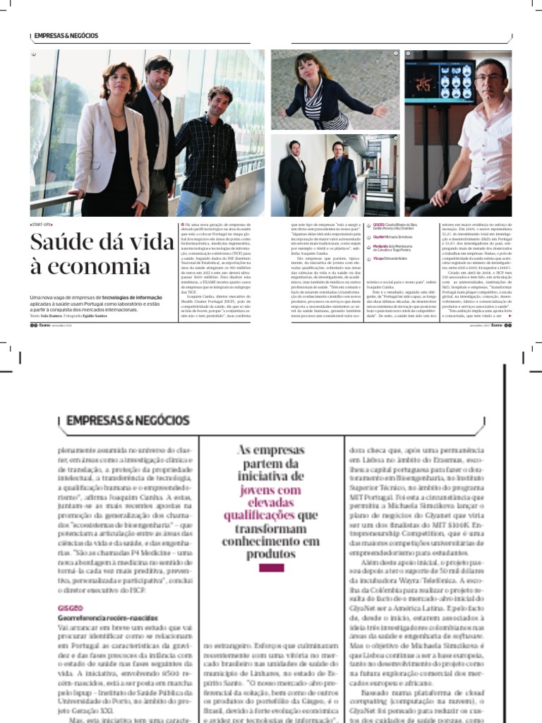 elevado perfil tecnolgico na rea da sade que est a colocar Portugal no mapa global dos negcios em reas de ponta como biofarmacutica, medicina regenerativa, nanotecnologias e tecnologias de informao, comunicao e eletrnica (TICE) para a sade. Segundo dados do INE (Instituto Nacional de Estatstica), as exportaes na rea da sade atingiram os 910 milhes de euros em 2011 e este ano dever ultrapassar 1000 milhes. Para ilustrar esta tendncia, a ExamE mostra quatro casos de empresas que se integram no subgrupo das TICE. Joaquim Cunha, diretor executivo do Health Cluster Portugal (HCP), polo de competitividade da sade, diz que s no se fala de boom, porque a conjuntura assim no o tem permitido, mas confirma