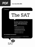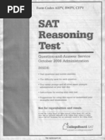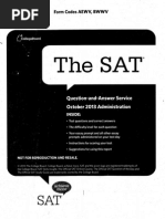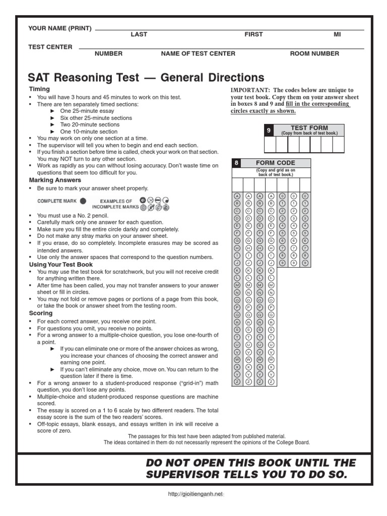 You must use a No. 2 pencil. Carefully mark only one answer for each question. Make sure you ll the entire circle darkly and completely. Do not make any stray marks on your answer sheet. If you erase, do so completely. Incomplete erasures may be scored as intended answers. Use only the answer spaces that correspond to the question numbers. You may use the test book for scratchwork, but you will not receive credit for anything written there. After time has been called, you may not transfer answers to your answer sheet or ll in circles. You may not fold or remove pages or portions of a page from this book, or take the book or answer sheet from the testing room. For each correct answer, you receive one point. For questions you omit, you receive no points. For a wrong answer to a multiple-choice question, you lose one-fourth of a point. If you can eliminate one or more of the answer choices as wrong, you increase your chances of choosing the correct answer and earning one point. If you cant eliminate any choice, move on. You can return to the question later if there is time. For a wrong answer to a student-produced response (grid-in) math question, you dont lose any points. Multiple-choice and student-produced response questions are machine scored. The essay is scored on a 1 to 6 scale by two different readers. The total essay score is the sum of the two readers scores. Off-topic essays, blank essays, and essays written in ink will receive a score of zero.