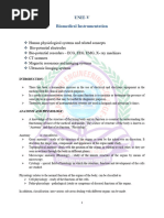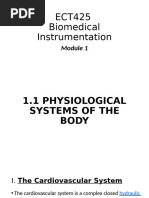 PHYSIOLOGICAL SYSTEM OF THE BODY:The physiology of human system of the body and source of biomedical system are shown in fig. Inside the human body one can find electrical, mechanical, thermal, hydraulic, pneumatic, chemical & various other types of system, each of which communicates with an external environment & internally with the other system of the body. The integrated operation of all these system & their various sub systems help to sustain life learn to perform useful task. The functional system of the body are the nervous system the cardiovascular system & pulmonary system. The major system communicates with each other as well as external environment. The major physiological system of the body are given below. 1. Cardiovascular system 2. Respiratory system 3. Nervous system 1. CARDIOVASCULAR SYSTEM:- The cardiovascular system helps in blood circulation from heart to body parts & vice versa there heart plays an important role it acts as hydraulic pump & circulate the blood through a complex network of blood vessel. This is subdivided into two parts. (a.) Heart & (b.) Circulatory system (a.) HEART:- It has four walls. i.e. TRICUSPID VALVE, PULMONARY VALVE, BISCUSPID VALVE, AORTIC VALVE. WORKING OF HEART:- The deoxygenated blood i.e. blood with CO2 & waste transported to right atrium through vena cava. Similar with the oxygen reach blood from lungs transported to the left atrium. Due to this pressure develop in right and left atrium which opens tricuspid valve of right heart & bicuspid valve of left side. At this situation S.A. NODE generate an electrical signal which is propagated through muscles of atrium. Due to excitation of atrium muscles both the atrium contracted & thus CO2 blood reached into right ventricle & O2 reached blood into left ventricle. This is the first phase of blood circulation known as diastole process because of A.B. NODE the electrical signal delays for .12 sec. to