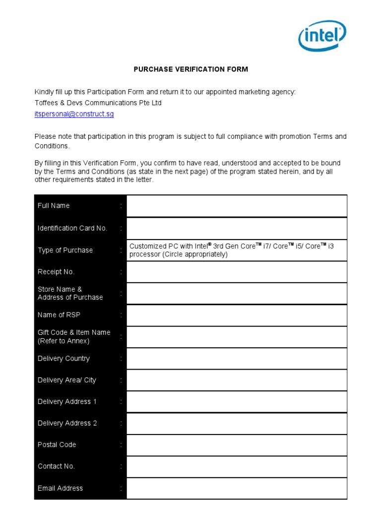 BEFORE ENTERING THE CONTEST. THIS IS A LEGALLY BINDING AGREEMENT BETWEEN YOU AND INTEL ESTABLISHING THE TERMS AND CONDITIONS UNDER WHICH YOU ARE ENTITLED TO PARTICIPATE IN THE CONTEST. BY ENTERING THE CONTEST, YOU CONFIRM THAT YOU HAVE READ AND UNDERSTOOD, AND AGREE TO ABIDE BY, THESE TERMS AND CONDITIONS. Organiser The Its Personal Campaign, Buy from Intel Technology Provider contest (Promotion) is organized by Intel Semiconductor (US) Limited, 32nd Floor, Two Pacific Place, 88 Queensway, Central, Hong Kong [Its a regional campaign.] and/or its affiliates (Intel). Eligibility General eligibility requirements This Promotion is open to all interested participants 18 years old and above, and resident in Australia, Bangladesh, India, Pakistan, Singapore, Sri Lanka, Taiwan and Vietnam All entries must be submitted within the Contest Period. Entries submitted outside of the Contest Period will be disqualified from the Contest. Not eligible: The following are not eligible to participate in the Promotion: Employees of Intel and their immediate family members. Employees of any party which is directly involved in organizing, promoting or conducting the Promotion. Employees of external auditors who are directly involved in the Promotion. Promotion specifics: This Promotion is for consumers who have bought an Intel 3rd Generation CoreTM Processor. Consumers who have bought an Intel 3rd Generation CoreTM Processor will receive a gift worth USD$20 for Core i7 purchase, i5 for USD$15 and i3 for USD$10. All recording, transportation, accommodation, personal costs and/or any other costs, fees and/or other expenses that are incurred to participate in this Promotion and to redeem the prize is the sole responsibility of the respective receiver. This promotion is in no way sponsored, endorsed or administered by, or associated with Facebook. You understand that you are providing your information to Intel and not to Facebook. The Promotion Period shall be from 28 September 2012 through 4 November 2012. All entries received outside the Promotion Period will be disqualified. By entering the Promotion and entering the information/contact details required, you agree that Intel may use the information/contact details that you provide for purposes of administering the Promotion and to contact the gift receiver. Mechanics 1. Participants may participate in the campaign through Intels Facebook pages for Australia, Bangladesh, India, Pakistan, Singapore, Sri Lanka, Taiwan and Vietnam. 2. Participants must click the post on Facebook which shows why you need to customize your PC find the participating ITPs in country along with the gift they can receive with the purchase of Intel 3 rd Generation Core Processor. 3. Go to the listed stores purchase Intel 3rd Generation Core Processor purchaser will send a copy of purchasing invoice along with shipping address plus the desired gift email it to itspersonal@construct.sg will send the prize to the purchaser. How can consumers receive gift: Participants who buy an Intel 3rd Generation CoreTM Processor and who follow the redemption process stated