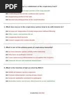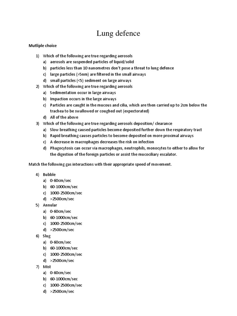 Mutliple choice 1) Which of the following are true regarding aerosols a) aerosols are suspended particles of liquid/solid b) particles less than 10 nanometres dont pose a threat to lung defence c) large particles (>5nm) are filtered in the small airways d) small particles (<5) sediment on large airways 2) Which of the following are true regarding aerosols a) Sedimentation occur in large airways b) Impaction occurs in the large airways c) Particles are caught in the mucous and cilia, which are then carried up to 2cm below the trachea to be swallowed or coughed out (expectorated) d) All of the above 3) Which of the following are true regarding aerosols deposition/ clearance a) Slow breathing caused particles become deposited further down the respiratory tract b) Rapid breathing causes particles to become deposited on more proximal airways c) A decrease in macrophages decreases the risk on infection d) Phagocytosis can occur via macrophages, neutrophils, monocytes to either to allow for the digestion of the foreign particles or assist the mucociliary escalator. Match the following gas interactions with their appropriate speed of movement. 4) Bubble a) 0-60cm/sec b) 60-1000cm/sec c) 1000-2500cm/sec d) >2500cm/sec 5) Annular a) 0-60cm/sec b) 60-1000cm/sec c) 1000-2500cm/sec d) >2500cm/sec 6) Slug a) 0-60cm/sec b) 60-1000cm/sec c) 1000-2500cm/sec d) >2500cm/sec 7) Mist a) 0-60cm/sec b) 60-1000cm/sec c) 1000-2500cm/sec d) >2500cm/sec