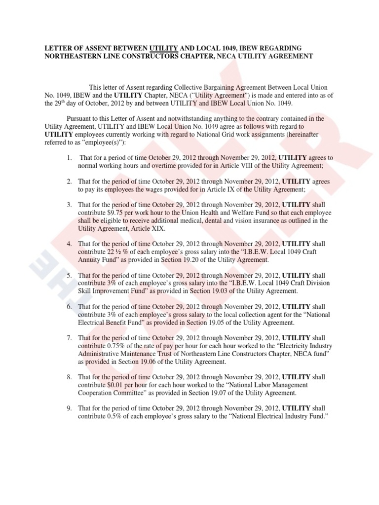 day of October, 2012 by and between UTILITY and IBEW Local Union No. 1049. Pursuant to this Letter of Assent and notwithstanding anything to the contrary contained in the Utility Agreement, UTILITY and IBEW Local Union No. 1049 agree as follows with regard to
