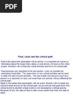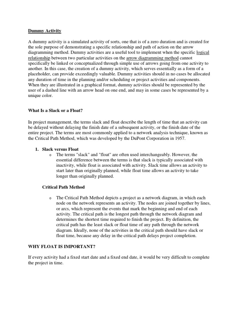 sole purpose of demonstrating a specific relationship and path of action on the arrow diagramming method. Dummy activities are a useful tool to implement when the specific logical relationship between two particular activities on the arrow diagramming method cannot specifically be linked or conceptualized through simple use of arrows going from one activity to another. In this case, the creation of a dummy activity, which serves essentially as a form of a placeholder, can provide exceedingly valuable. Dummy activities should in no cases be allocated any duration of time in the planning and/or scheduling or project activities and components. When they are illustrated in a graphical format, dummy activities should be represented by the user of a dashed line with an arrow head on one end, and may in some cases be represented by a unique color. What Is a Slack or a Float? In project management, the terms slack and float describe the length of time that an activity can be delayed without delaying the finish date of a subsequent activity, or the finish date of the entire project. The terms are most commonly applied to a network analysis technique, known as the Critical Path Method, which was developed by the DuPont Corporation in 1957. 1. Slack versus Float o The terms "slack" and "float" are often used interchangeably. However, the essential difference between the terms is that slack is typically associated with inactivity, while float is associated with activity. Slack time allows an activity to start later than originally planned, while float time allows an activity to take longer than originally planned. Critical Path Method