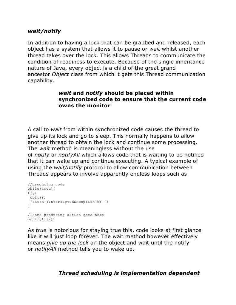 it to pause or wait whilst another thread takes over the lock. This allows Threads to communicate the condition of readiness to execute. Because of the single inheritance nature of Java, every object is a child of the great grand ancestor Object class from which it gets this Thread communication capability. wait and notify should be placed within synchronized code to ensure that the current code owns the monitor