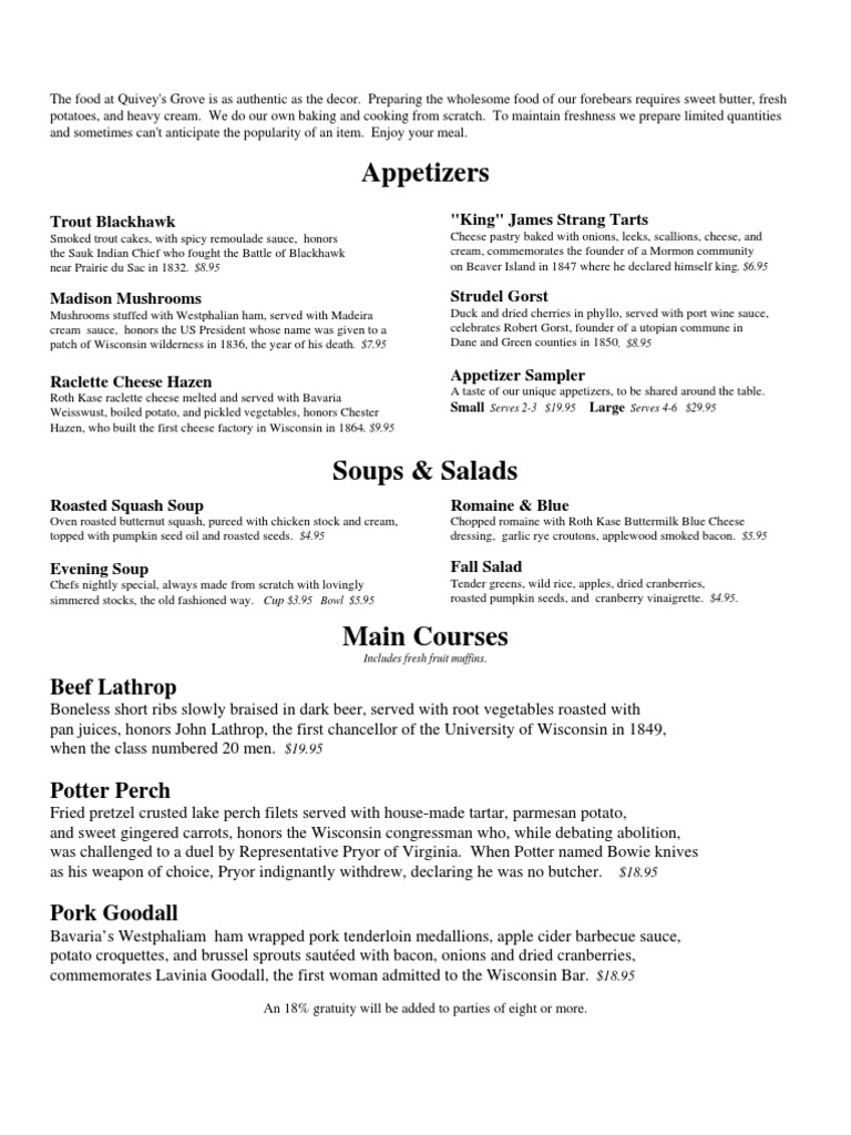 Duck and dried cherries in phyllo, served with port wine sauce, celebrates Robert Gorst, founder of a utopian commune in Dane and Green counties in 1850. $8.95
