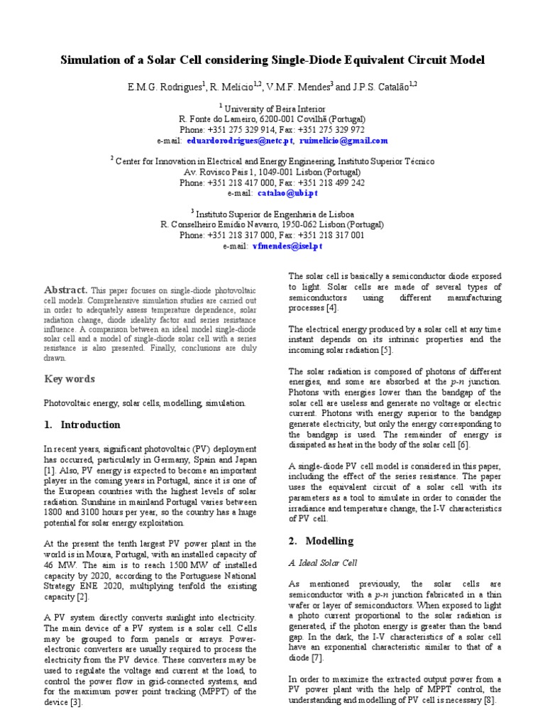 Center for Innovation in Electrical and Energy Engineering, Instituto Superior Tcnico Av. Rovisco Pais 1, 1049-001 Lisbon (Portugal) Phone: +351 218 417 000, Fax: +351 218 499 242 e-mail: catalao@ubi.pt Instituto Superior de Engenharia de Lisboa R. Conselheiro Emdio Navarro, 1950-062 Lisbon (Portugal) Phone: +351 218 317 000, Fax: +351 218 317 001 e-mail: vfmendes@isel.pt The solar cell is basically a semiconductor diode exposed to light. Solar cells are made of several types of semiconductors using different manufacturing processes [4]. The electrical energy produced by a solar cell at any time instant depends on its intrinsic properties and the incoming solar radiation [5]. The solar radiation is composed of photons of different energies, and some are absorbed at the p-n junction. Photons with energies lower than the bandgap of the solar cell are useless and generate no voltage or electric current. Photons with energy superior to the bandgap generate electricity, but only the energy corresponding to the bandgap is used. The remainder of energy is dissipated as heat in the body of the solar cell [6]. A single-diode PV cell model is considered in this paper, including the effect of the series resistance. The paper uses the equivalent circuit of a solar cell with its parameters as a tool to simulate in order to consider the irradiance and temperature change, the I-V characteristics of PV cell.