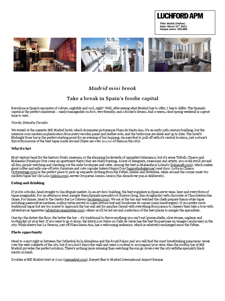 Barcelona is Spains epicentre of culture, nightlife and cool, right? Well, after seeing what Madrid has to offer, I beg to differ. The Spanish capital is the perfect minibreak easily manageable on foot, very friendly, and a foodies dream. And a warm, clear spring weekend is a great time to visit. Words: Natasha Tomalin We stayed at the majestic ME Madrid hotel, which dominates picturesque Plaza de Santa Ana. Its an early 19th-century building, but the interiors ooze modern sophistication from every wooden panel and leather sofa, and the bedrooms are sleek and up to date. The hotels Midnight Rose bar is the perfect starting point for an evening of bar hopping. An easy feat to pull off with its central location, just a stones throw from some of the best tapas joints around (there are over 20,000 of them in the city). Why it's hot Most visitors head for the historic Prado museum, or the shopping boulevards of upmarket Salamanca, but its areas TriBall, Chueca and Malasaa (Penlope Cruz owns an apartment there) that are really buzzing. A hive of designers, musicians and artists, you could stroll around all day, people watching and checking out the indie boutiques and cafes. Among the best in Malasaa is Lolinas (lolinacafe.com), which makes great coffee and sells one-off retro furniture and cute cupcake bakery Happy Day (happydaybakery.es) next door. Lotta in Chueca (lottavintage.com) is the perfect place to pick up exquisite clothing from the Fifties, Sixties and Seventies, while around the corner must-try modern tapas bar Ol Lola (olelola.com), serves Croquetas Jamn Jamn (the Almodvar pun is deliberate). Eating and drinking If youre a foodie, head straight to San Miguel market. In an art deco building, the best suppliers in Spain serve wine, beer and every form of tapas imaginable. For an afternoon treat, sample them Spanish speciality of churros (long, thin doughnuts) with chocolate at Chocolateria San Gines. For dinner, head to the Gastro Bar Le Cabrera (lecabrera.com). We sat at the bar and watched the chefs prepare fusion-style tapas including passionfruit sardines, scallop tartar served in a gem lettuce leaf and bombones de carnes (mini hamburgers). If you prefer more traditional tapas but are too scared to approach the bar and ask for pinchos (bread with everything from jamon to cheese) then take a tour with Adventurous Appetites (adventurousappetites.com), where youll be led around a selection of the best places to sample the specialties. One tip: the dirtier the floor, the better the bar its traditional to throw anything you cant eat (prawn shells, olive stones, napkins and toothpicks) at your feet. If you want to go it alone, the kitsch Los Gatos on Calle de Jess has the best Boquerones en vinagre (anchovies) in the city. While sherry bar La Venecia, just off Plaza Santa Ana, has a welcoming ambience, which is relatively unchanged since the Fifties. Photo opportunity Head to a spot right in between the Cathedral de la Almudena and the Royal Palace and you will find the most breathtaking panoramic views over the west outskirts of the city, but if you dont fancy the walk and want a cocktail to accompany your view, then the rooftop bar at ME Madrid provides the perfect solution. Theres nothing more relaxing than watching the sun go down over the city withthe speciality black mojito in hand. Doubles at ME Madrid start at 220 (memadrid.com). Easyjet flies to Madrid International Airport Barajas