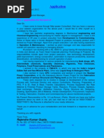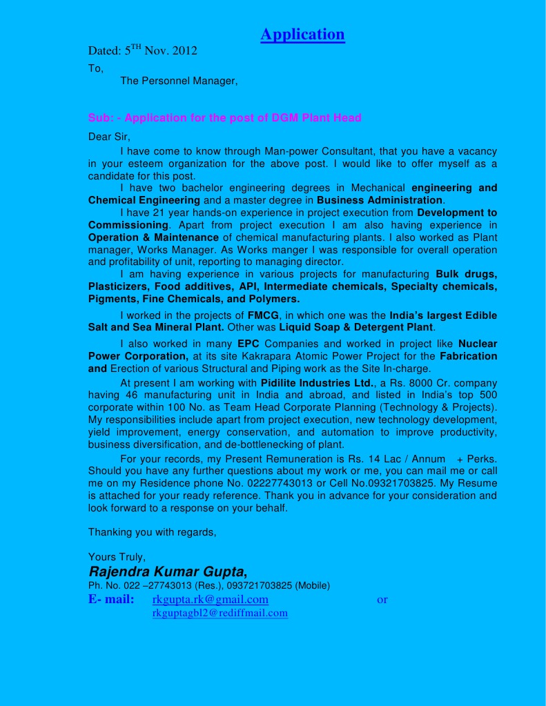 Dear Sir, I have come to know through Man-power Consultant, that you have a vacancy in your esteem organization for the above post. I would like to offer myself as a candidate for this post. I have two bachelor engineering degrees in Mechanical engineering and Chemical Engineering and a master degree in Business Administration. I have 21 year hands-on experience in project execution from Development to Commissioning. Apart from project execution I am also having experience in Operation & Maintenance of chemical manufacturing plants. I also worked as Plant manager, Works Manager. As Works manger I was responsible for overall operation and profitability of unit, reporting to managing director. I am having experience in various projects for manufacturing Bulk drugs, Plasticizers, Food additives, API, Intermediate chemicals, Specialty chemicals, Pigments, Fine Chemicals, and Polymers. I worked in the projects of FMCG, in which one was the Indias largest Edible Salt and Sea Mineral Plant. Other was Liquid Soap & Detergent Plant. I also worked in many EPC Companies and worked in project like Nuclear Power Corporation, at its site Kakrapara Atomic Power Project for the Fabrication and Erection of various Structural and Piping work as the Site In-charge. At present I am working with Pidilite Industries Ltd., a Rs. 8000 Cr. company having 46 manufacturing unit in India and abroad, and listed in Indias top 500 corporate within 100 No. as Team Head Corporate Planning (Technology & Projects). My responsibilities include apart from project execution, new technology development, yield improvement, energy conservation, and automation to improve productivity, business diversification, and de-bottlenecking of plant. For your records, my Present Remuneration is Rs. 14 Lac / Annum + Perks. Should you have any further questions about my work or me, you can mail me or call me on my Residence phone No. 02227743013 or Cell No.09321703825. My Resume is attached for your ready reference. Thank you in advance for your consideration and look forward to a response on your behalf. Thanking you with regards, Yours Truly,