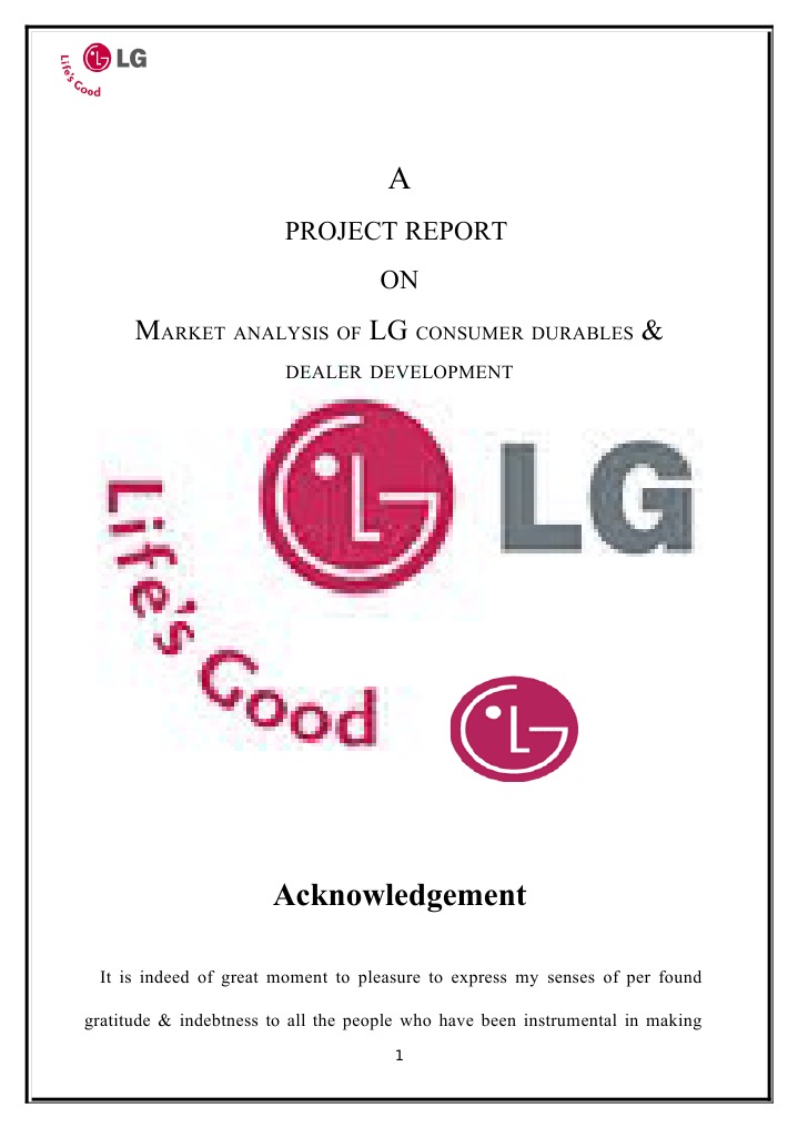 July that is generally termed as the partial fulfillment of our pgp program holds extreme importance for our whole career. Similarly while doing the topic Market Survey on LG consumer durables & dealer development as a summer trainee I took many my projects in help. It gives me immense pleasure to acknowledge LG ELECTRONICS INDIA Ltd., which has been nice enough to give me a chance to do my summer training and providing me wonderful support through out my training period and afterward. I am thankful to MR for allowing me to do my research in his office by knowing my interest in doing research on LG consumer durables and dealer development research.