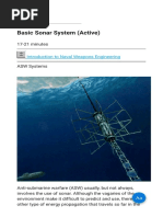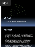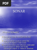 a drum works. The sounds generated by this projector were used to measure the ocean temperature during acoustic tomography experiments. Photo courtesy of Scripps Institution of Oceanography. Small individual projectors can also be used together to create directional beams. These are called projector arrays. In a projector array, all of the individual projectors transmit at the same time to generate directional beams. The arrays are designed so that the sound waves generated by each of the array elements add together in the direction that the sound is wanted, but do not add together in other directions Sonar Sonar (sound navigation and ranging) is a technology that uses acoustical waves to sense the location of objects in the ocean. The simplest sonar devices send out a sound pulse from a transducer, and then precisely measure the time it takes for the sound pulses to be reflected back to the transducer. The distance to an object can be calculated using this time difference and the speed of sound in the water (approximately 1,500 meters per second). More sophisticated sonar systems can provide additional direction and range information. Sonar was developed during World War I as an aid in finding both submarines and icebergs. Major improvements were made on this technology during World War II, and eventually scientists adapted the highly sensitive equipment for use in oceanographic research.